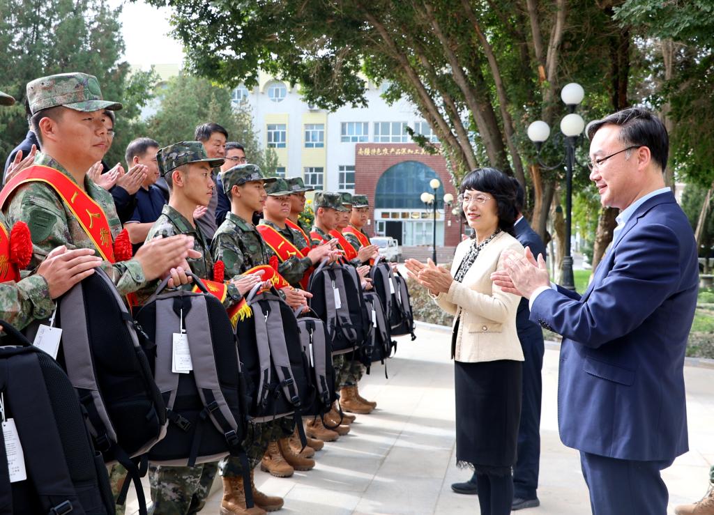 張愛(ài)萍、閆祥林、居來(lái)提?司馬義向應(yīng)征入伍大學(xué)生們贈(zèng)送了學(xué)校紀(jì)念品,祝福他們一切順利、一路平安。