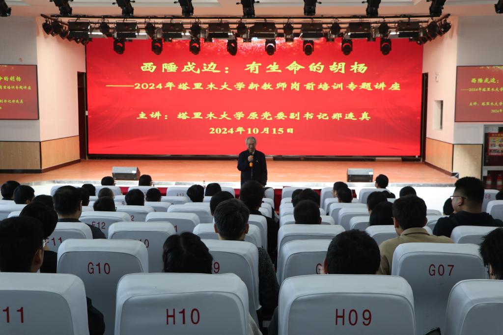 10月15日下午,塔里木大學原黨委副書記鄭連真,在新文科樓518報告廳,為學校2024年新入職教師作主題報告。他以《西陲戍邊:有生命的胡楊》為題,講述了自己積極響應黨的號召,投身邊疆、扎根兵團的心路歷程和熱血故事。