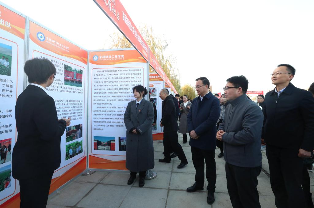 會前,與會領導嘉賓來到首屆兵團大學生社會實踐交流展示活動現場,與同學們親切交流,充分肯定了同學們用實踐擔當書寫青春華章的志氣、勇氣和毅力,鼓勵廣大青年學子積極投身社會實踐,為中國式現代化挺膺擔當。