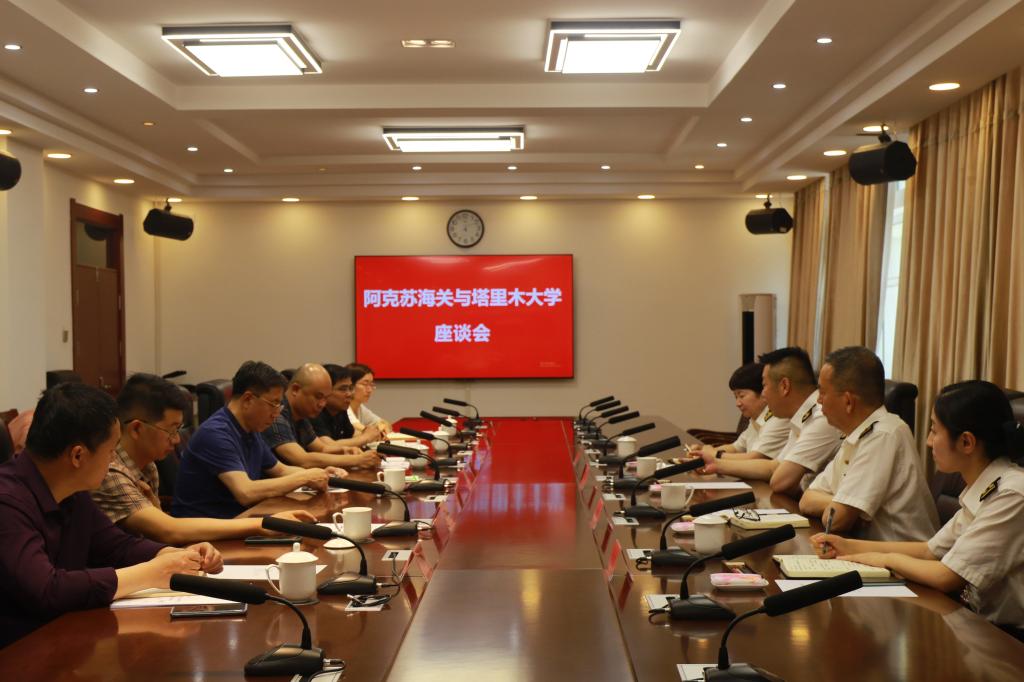 為推進(jìn)主題教育走深走實(shí),6月13日上午,阿克蘇海關(guān)副關(guān)長(zhǎng)張軍、王鵬舉來(lái)我校考察調(diào)研,與我校黨委書(shū)記趙光輝,黨委常委、副校長(zhǎng)趙峰華等領(lǐng)導(dǎo)在行政樓四號(hào)洽談室進(jìn)行深入交流。