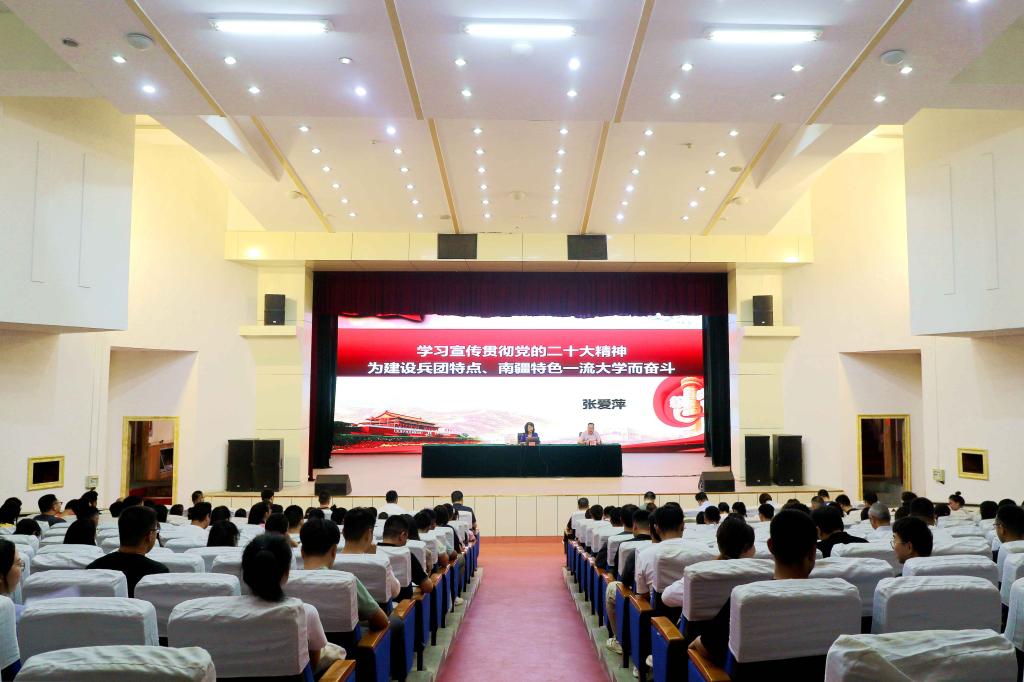 張愛萍圍繞黨的二十大召開的背景、主題;過去5年的工作和新時代10年的偉大變革;全面建設社會主義現代化國家的目標任務;貫徹黨的二十大精神,為建設兵團特點、南疆特色一流大學而奮斗等方面,進行了全面深入的講解。要求大家用實際行動踐行胡楊精神,一心撲在黨的教育事業上,落實好立德樹人根本任務,構建“四課堂”同向協作的胡楊精神育人體系,為培養愛國愛疆、擔當奉獻的新時代戍邊人貢獻更大力量。